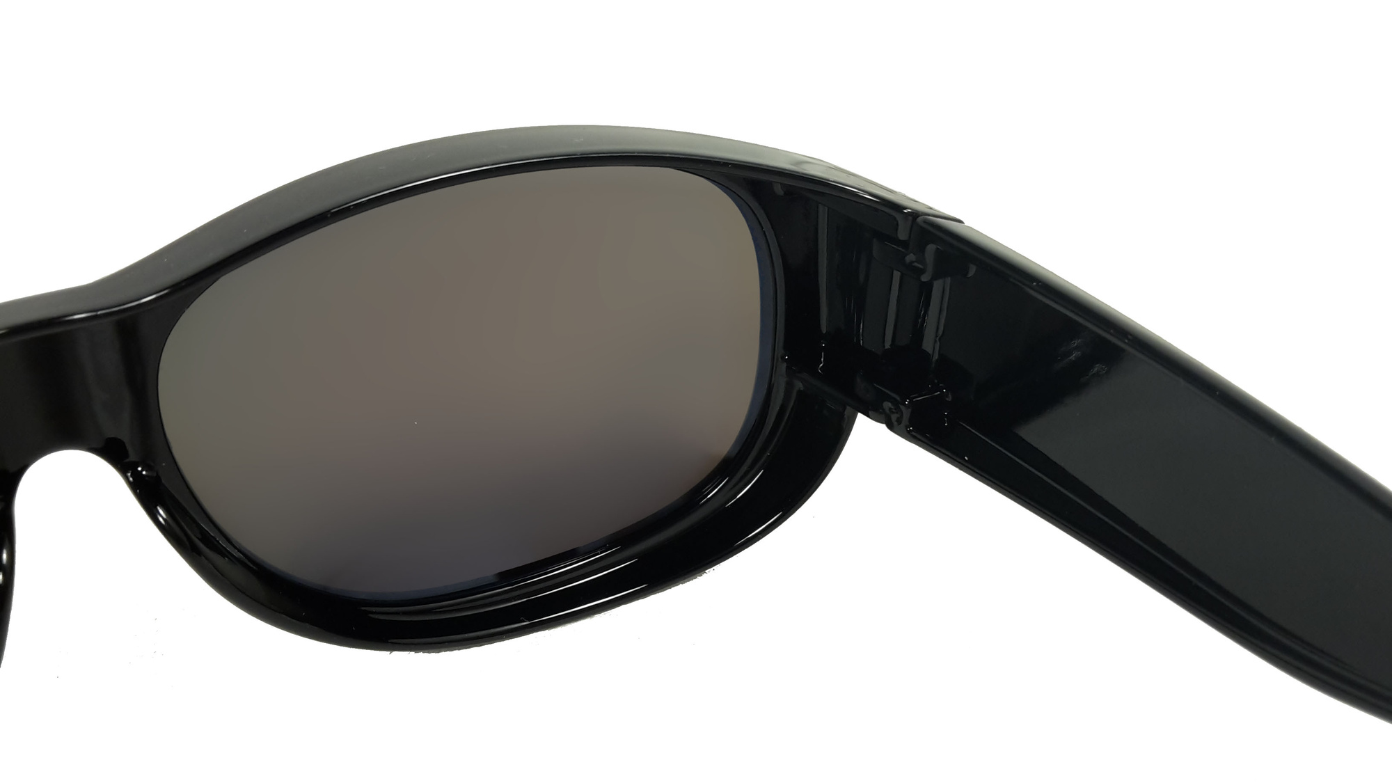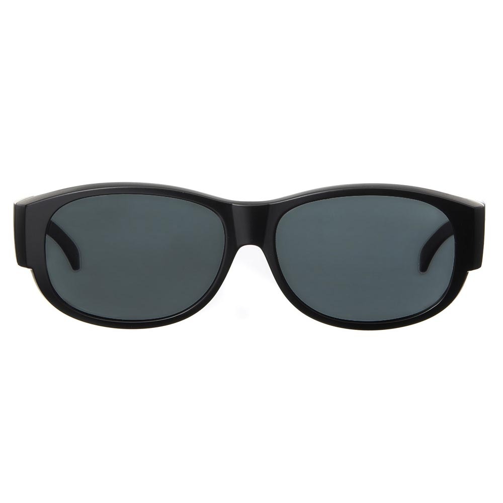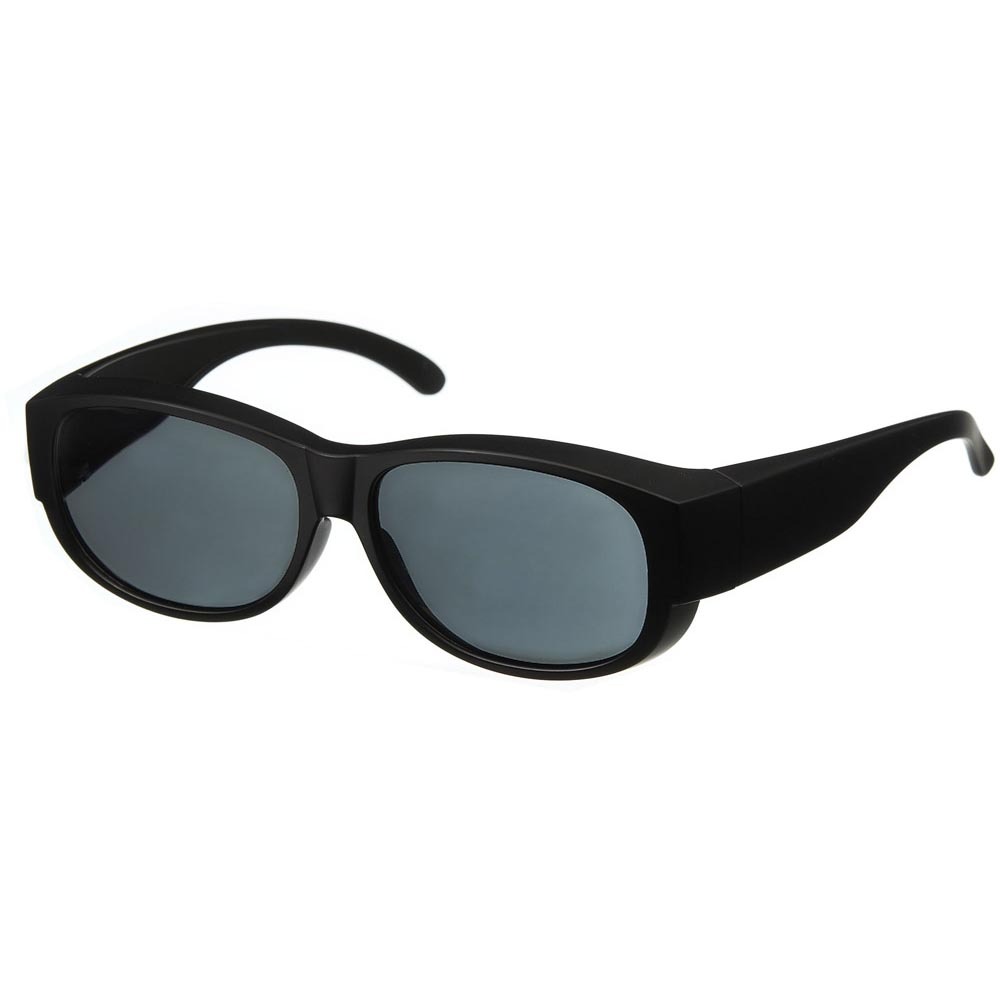 Fit-over solbriller til at sætte uden på briller. Modellen har sorte linser og sort stel.