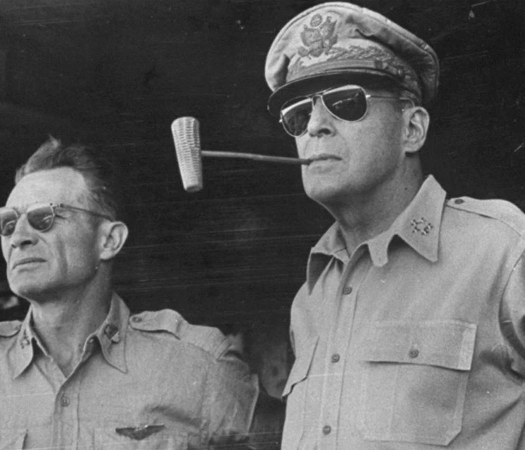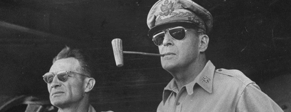 General Douglas MacArthur med sin pibe og sine ikoniske aviator solbriller.