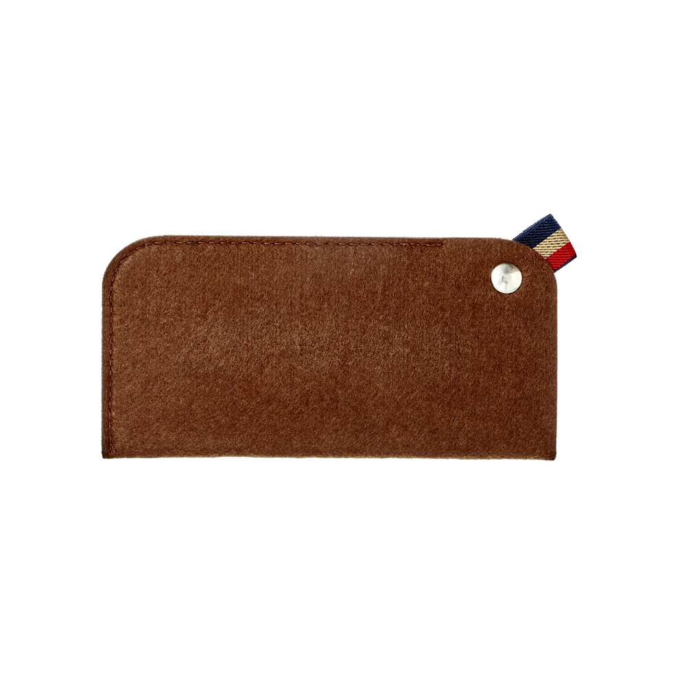 Flot filt etui i brun med 3-farvet snip. Filten er skånsom mod brillen, og beskytter brillen mod ridser og slag.