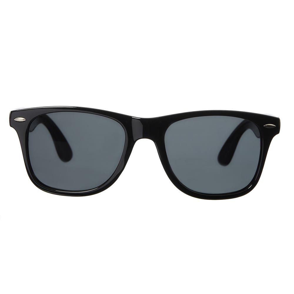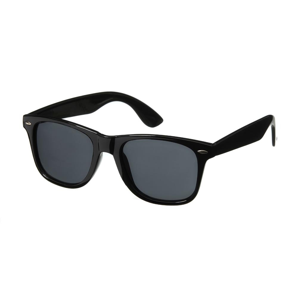 Polaroid solbrille i klassisk Wayfarer-stil med sorte linser og sort stel.